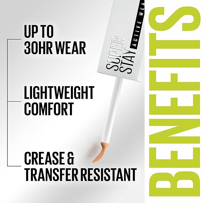 - Maybelline's Super Stay Active Wear Concealer delivers up to 30-hour wear and full coverage; This long lasting concealer wipes out dark circles and imperfections, giving you a comfortable, natural look
