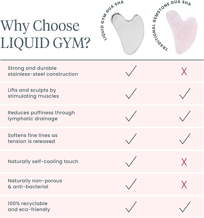 - High Quality Skin Care Tools - When it comes to skin care tools, choose high-quality options like our LIQUID GYM Gua Sha made from self-cooling and recyclable stainless steel. This gua sha tool for face can also be used as a jawline sculptor to promote facial contouring and definition. Investing in effective skin care tools like a guasha tool can help you achieve your desired results and promote long-term skin health.