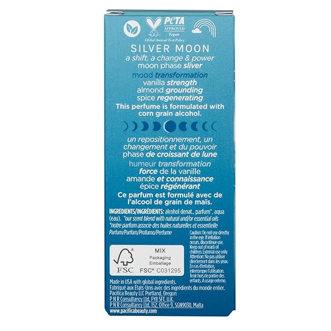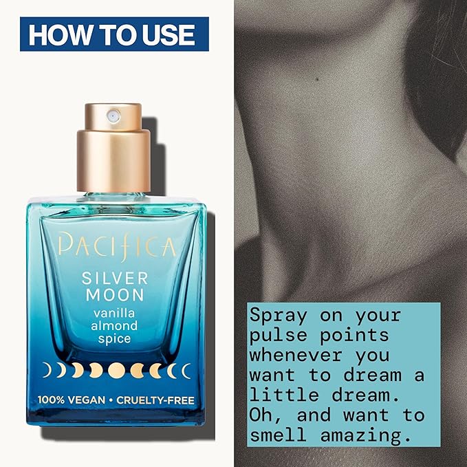 - Inspired by the Moon: Part of Pacifica’s Moon Moods collection, Silver Moon is inspired by the magic of a silver moonrise – symbolizing shifts, change, and inner strength. Moon Mood: Vanilla for strength, Almond for grounding, Spice for regenerating. 🌙 Each spray uplifts your mood and adds a touch of mystique. The perfume comes in a travel-friendly 1 fl oz spray bottle, perfect for your bag or vanity. Made in the USA with thoughtfully sourced ingredients, it’s a feel-good fragrance you’ll love to wear and share.
