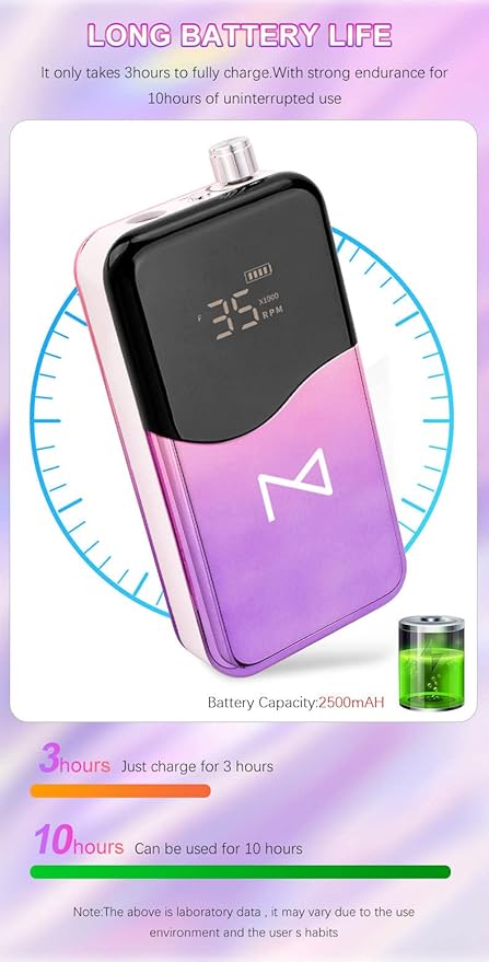 - Long-lasting battery for nonstop performance: Our M Mase nail drill for acrylic nails provides power that lasts. With a built-in rechargeable battery and coreless motor, the coreless nail drill can run continuously for up to 10 hours. Quick 2-3 hour recharge, and LCD battery status display to keep your appointments hassle-free