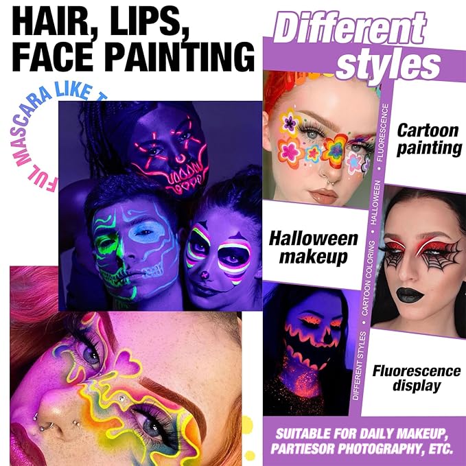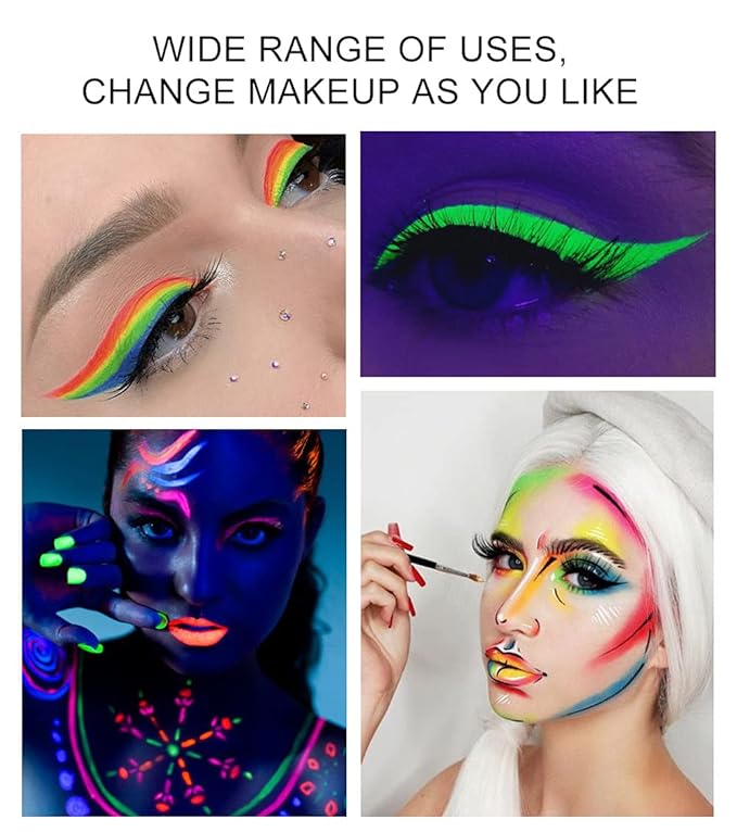 - WATER BASED EYELINER:6 colors can glow under UV/blacklight,it is NOT waterproof(01 palette has 4 glow color, 02 palette has 2 glow color).Not mess or transfer.No crack and won't fade until it's removed. Smudgeproof eyeliner apply on smoothly and dry pretty fast and are easy to remove with soapy warm water or wipes