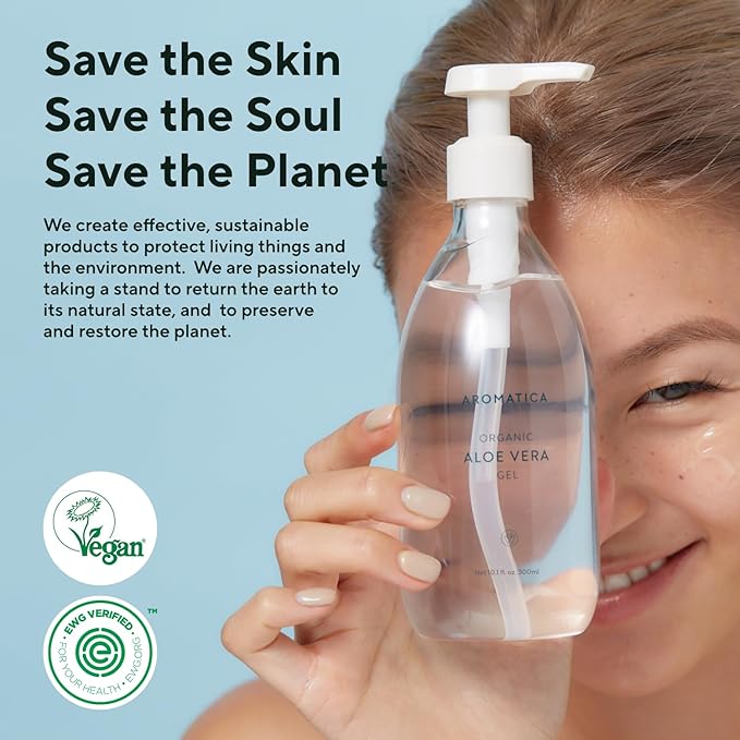 AROMATICA Organic Aloe Vera Gel (2 packs), After Sun Care and Sunburn Relief with Pure Aloe Vera Gel Face&Hair, Sun Burn Moisturizer EWG Verified (10.14oz/300ml)