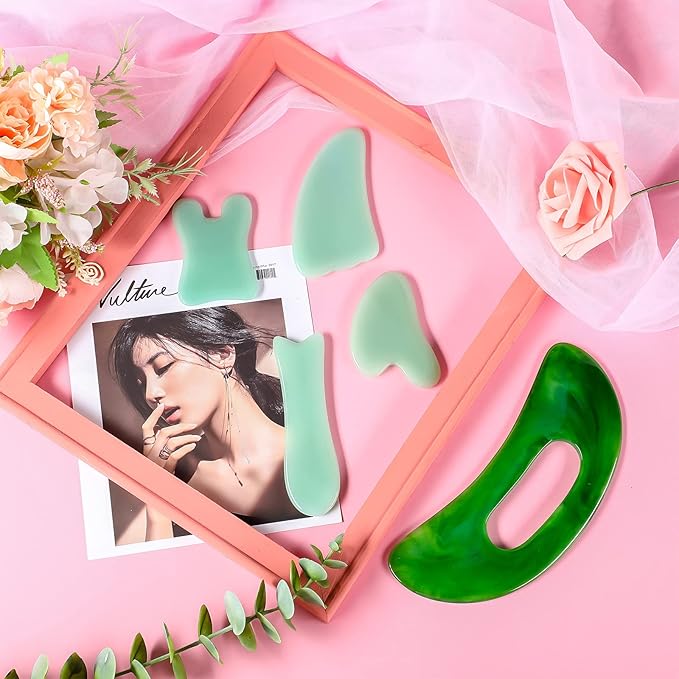 - Comfortable Material: Our gua sha tool with handle is made of high-quality resin material, the other 4 heart-shaped, coin-shaped, fish-shaped, triangle gua sha tools are made of jade, hand-carved and polished, easy to clean, sturdy and shatterproof, lightweight and portable, allowing you to enjoy a gua sha massage experience at any time, relieve muscle tension, and easily promote metabolism