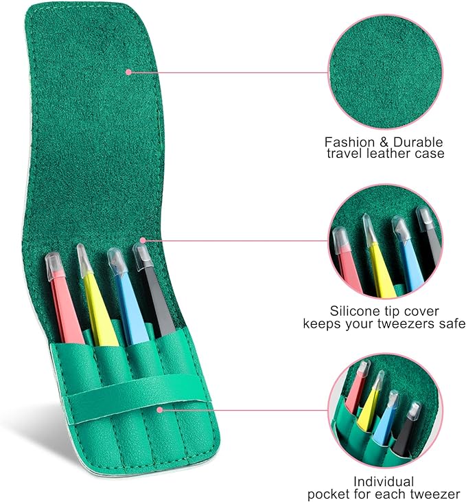 - Travel Leather Case: The exquisite leather case perfectly protects the eyebrow tweezers. Each tweezer has an individual pocket and each eyebrow tweezer has a head protective cover