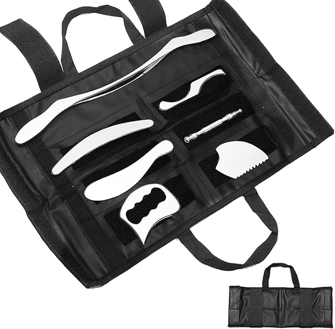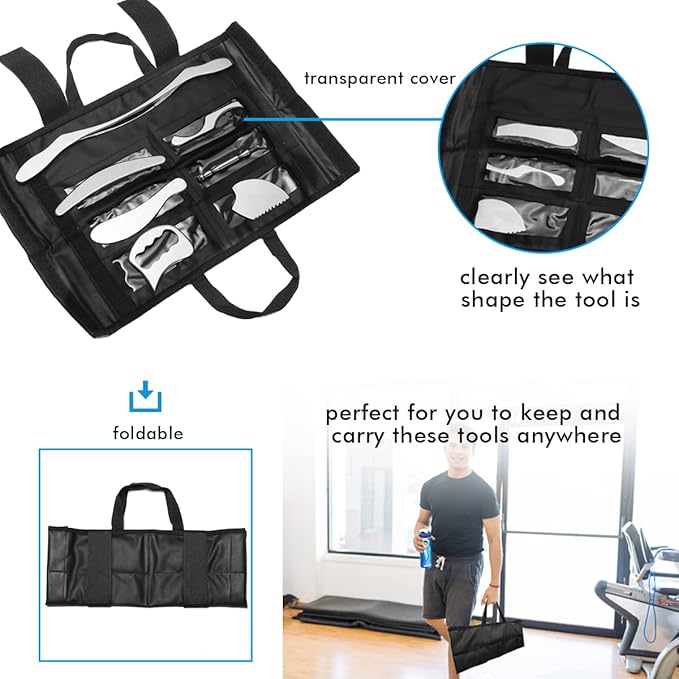 - PROTECTIVE PACKAGING BAG— The scraping massage tools come in an attractive, protective bag. Inside the bag are 7 independent spaces of different sizes to secure the individual tools. It is super light but sturdy enough for general protection during transportation.