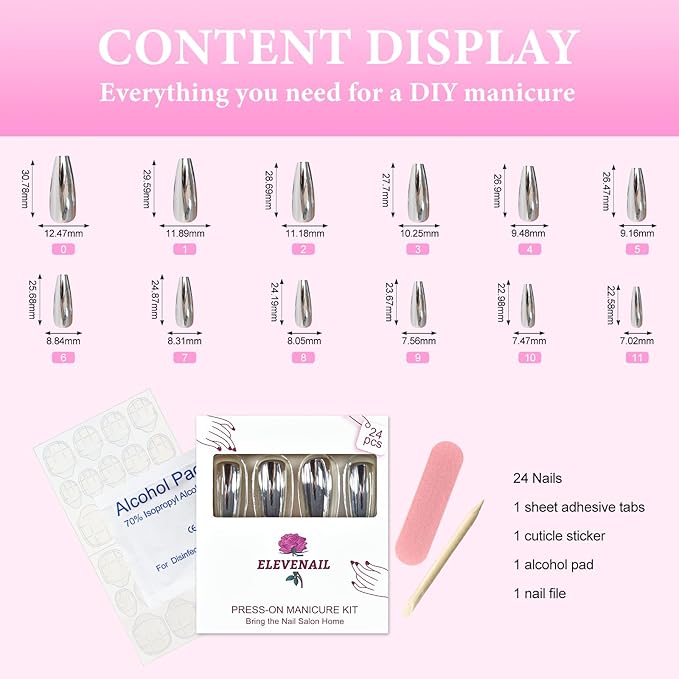 - 1. About the nails- Coffin Ballerina Press on Nails, Reflective Mirror Shiny Metallic Silver Fake False Nails, Super Long Punk Style, make you more charming.