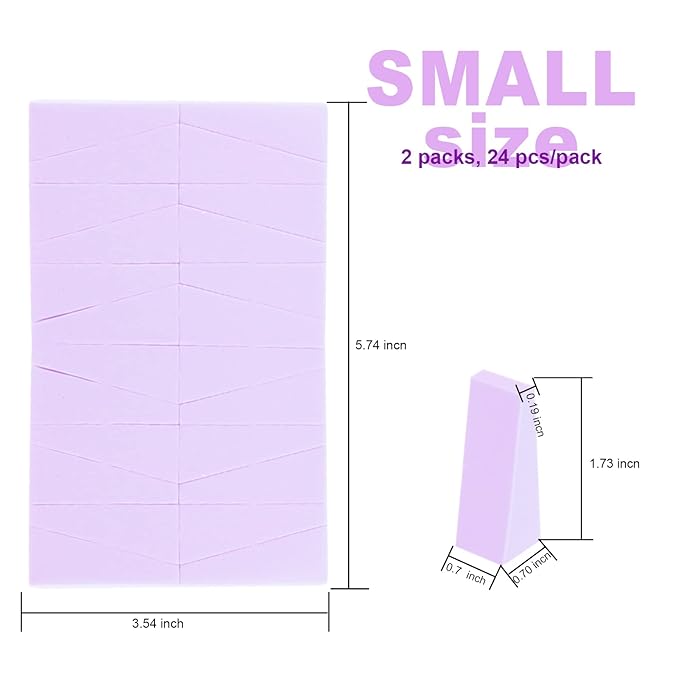 - Makeup Sponges Wedges: 2 colors, 48 pieces, the small, wedge shape makeup sponge makes it easy to apply product to those hard to reach areas such as underneath the eyes. Each pack has 24 precut wedges so you can easily pull them apart to provide each client with a hygienic makeup experience without sacrificing quality or performance.