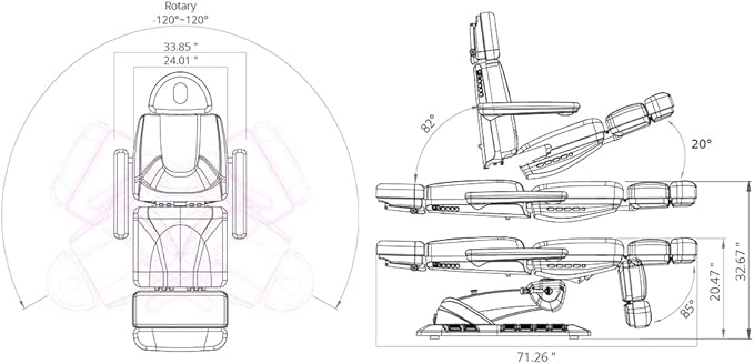 - Seat can rotate 60° from center in either direction for a maximum of 120°, Backrest can recline by up to 80°, Footrest can fold down by up to 85°, Seat can tilt up to 15°, Seat height is adjustable by up to 13 inches