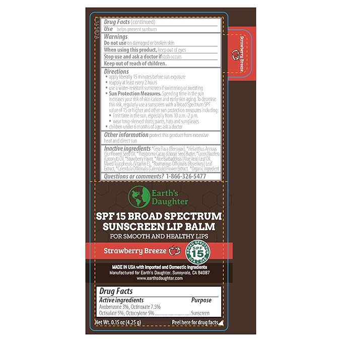 - BROAD SPECTRUM SUN PROTECTION – With SPF 15 (sun protection factor), our Earth’s Daughter SPF lip balm protects against both UVA and UVB rays. This broad spectrum protection combined with our premium organic moisturizing ingredients provides the ultimate all season chapped lip stick.