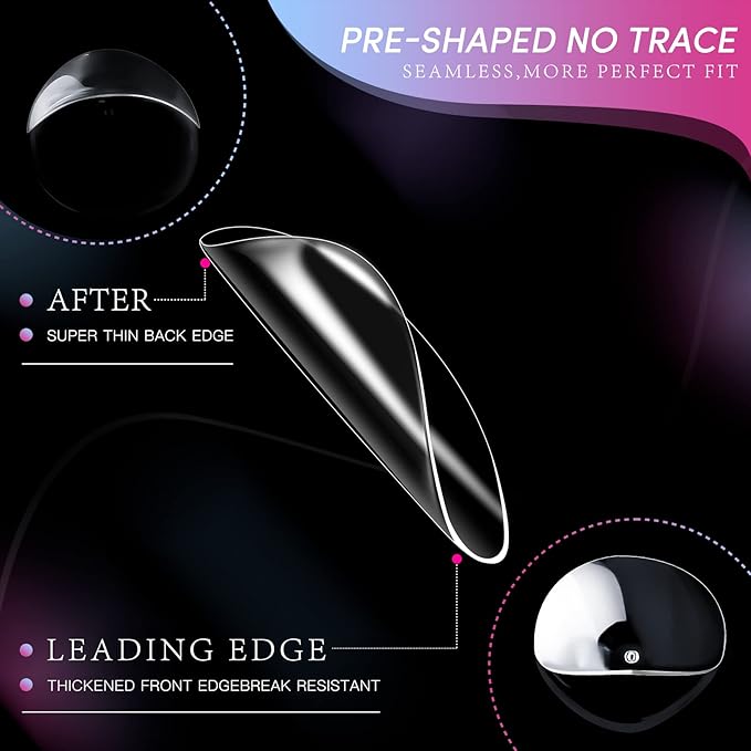 - 【Professional Full Cover Acrylic Nail Tips】: Clear almond tips have a thinner edge which is convenient for our to press fake nail tips tightly on our finger nails and almond nails has a more natural arc making our nails charming and elegant