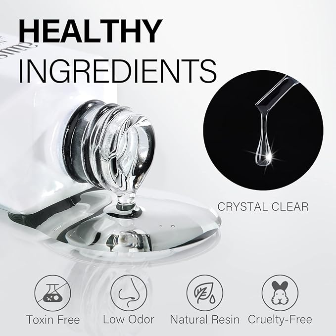 - HEALTHY INGREDIENT - The nail gel glue is made of natural resin material, cruelty-free, low odor and toxin-free, no harm for your nails. And the nails glue looks crystal clear, which will not turn yellow after opening, more like natural nails after applying.