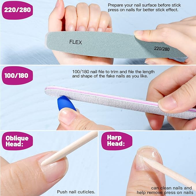 - Useful Manicure Tools: The orange wood nail sticks are double sided. The oblique head is used to push nail cuticles. The sharp head can clean your nails and help remove press on nails. 220/280 nail file helps to prepare your nail surface before stick press on nails and the 100/180 nail file can trim the press on nails to your desired length and shape.