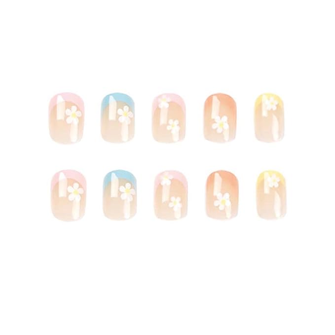 French Tip Press on Nails Short Nails for Women with Flowers Design Colorful Stick on Nails Square Acrylic Nails