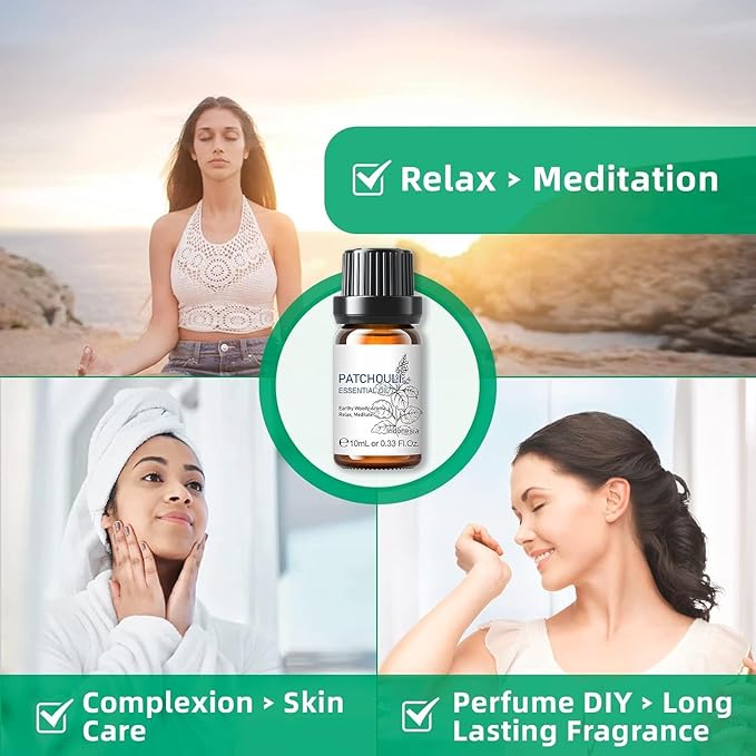 - Multi-Purpose: Patchouli essential oil has a multi-purpose natural remedy with a calming herbal and balsamic aroma that can help relax the mind, balancing emotions. Reduce the appearance of wrinkles. Promote a clear, healthy complexion