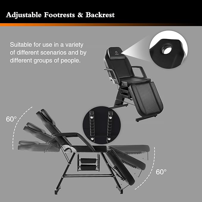 - ✔【 Multi-Purpose Tattoo Bed】 Tattoo bed with removable head pad, with face hole, easy to massage. Adjustable backrest and leg support can meet the needs of different customers. Such as beauty, tattoo, massage, facial, eyelashes
