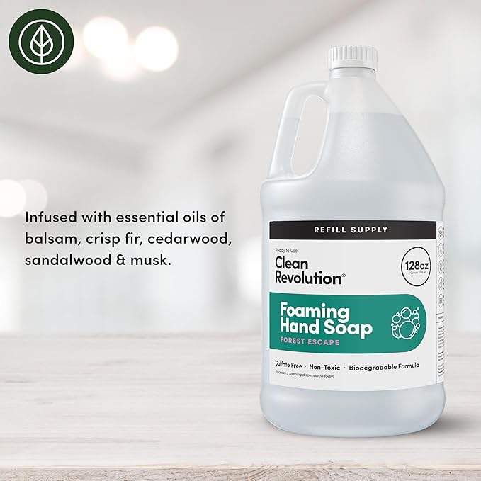 - REFILL & REUSE: Our Refill Supply container delivers exceptional value with 128 ounces of ready to use liquid foam soap designed to be used with Clean Revolution Refillable Foaming Hand Soap dispenser. This gallon jug has more than 8 refills, eliminating the need for individual single-use bottles and creating less plastic waste. Foaming Hand Soap dispenser sold separately.