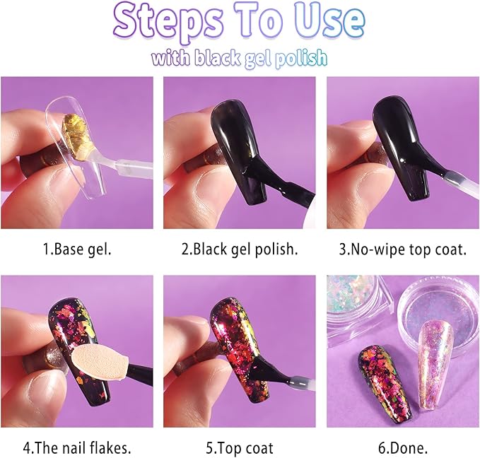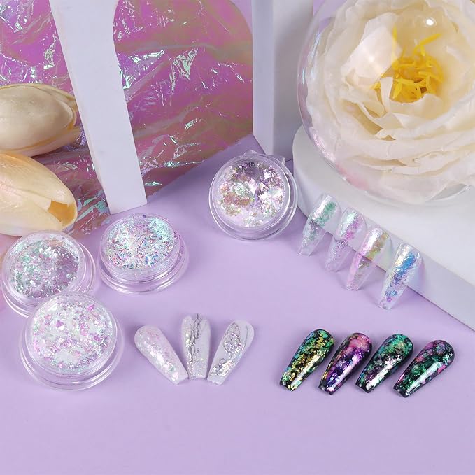 - Aurora & Chameleon Effects: The nail flakes are holographic, iridescent, transparent, thin, and soft, looking like colorful clouds, giving the nails pearl aurora sheen and chameleon effects, which can reflect the base color. The different bases will get distinct effects.