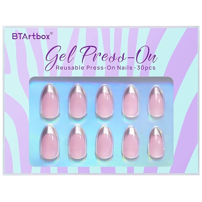 French Tip Press On Nails - BTArtbox Short Almond Fake Nails, Fit Perfectly & Natural Reusable Silver Outline Soft Gel Nails with Nail Glue and Jelly Glue in 16 Sizes, Rock Me