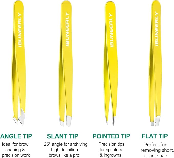 - Tweezers for Women: Come with 4 different colors eyebrows tweezers: slant tip, angle tip, flat tip and pointed tip. Perfect for eyebrows shaping, ingrown hair, first aid, facial nose hair