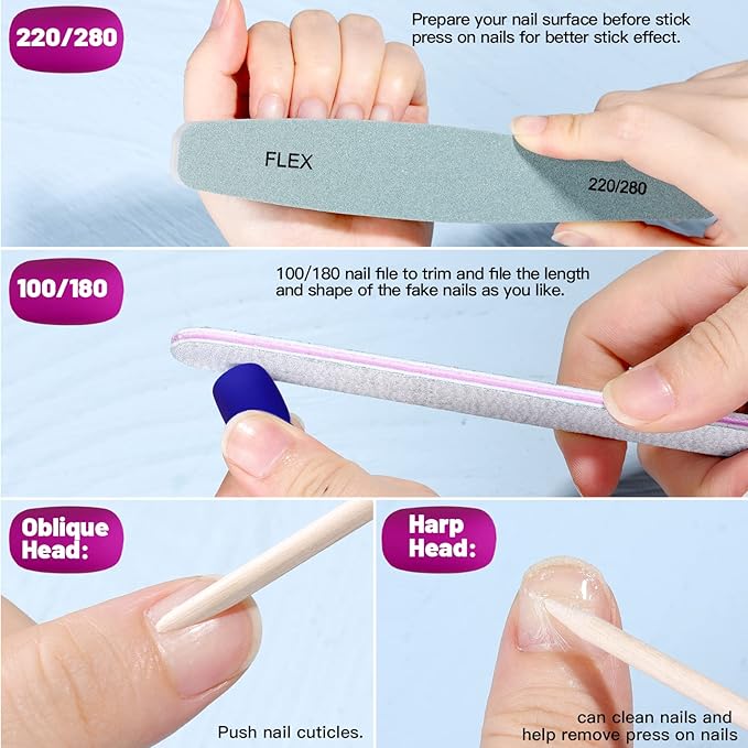 - Useful Manicure Tools: The orange wood nail sticks are double sided. The oblique head is used to push nail cuticles. The sharp head can clean your nails and help remove press on nails. 220/280 nail file helps to prepare your nail surface before stick press on nails and the 100/180 nail file can trim the press on nails to your desired length and shape.