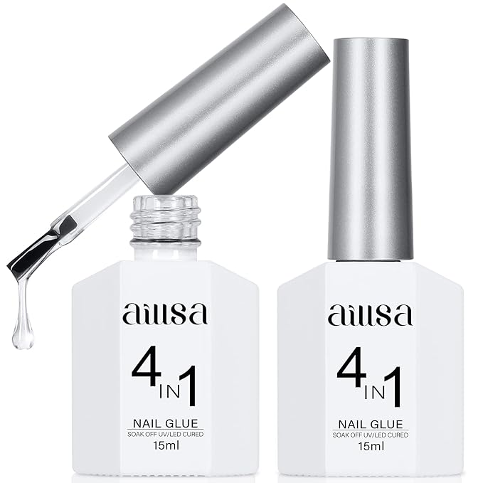 AILLSA 2PCS Gel Nail Glue for Acrylic Nails, 4 in 1 Super Strong Adhesive for False Tips, UV Curing Needed, 15ml High Capacity Extension Brush On for Rhinestone Pearl Foil