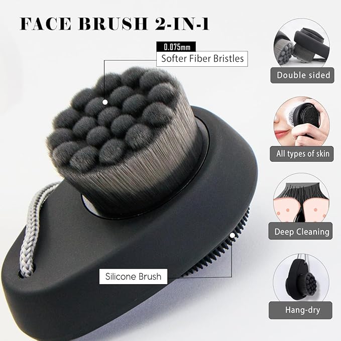 - ❣️【2-in-1 Design】: Each face brush features a soft bristle side and a silicone side, One sided is ultra fine soft bamboo charcoal fiber face brush, helps to gently deep clean pores; The other sided is silicone brush for exfoliating and massaging