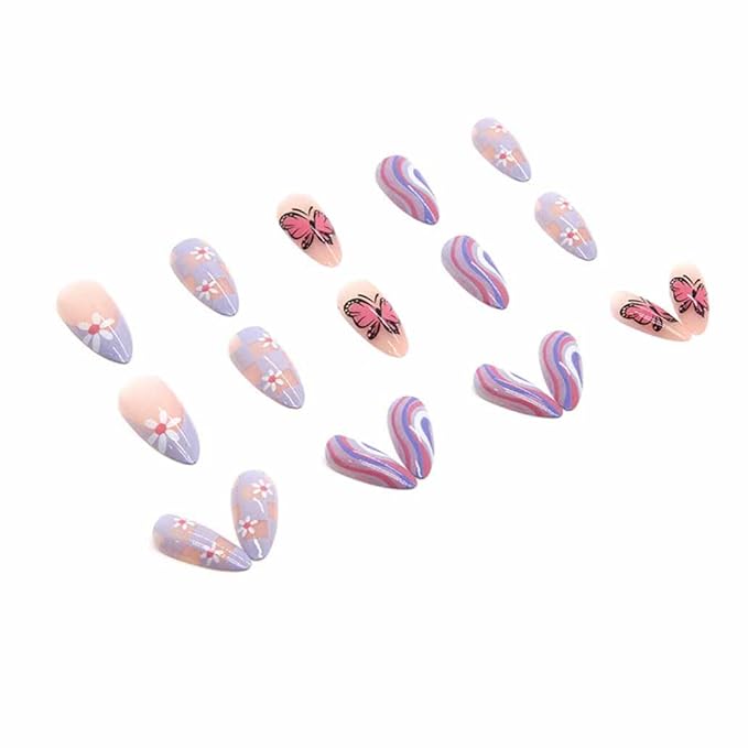 Butterfly Press on Nails Medium, Amlond Fake Nails Acrylic False Pink Nails,Artificial Nails for Women and Girls 24 pcs