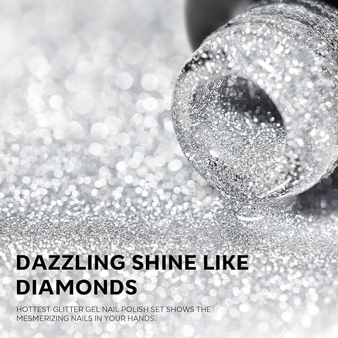 - GLITTER GEL NAIL POLISH: This silver glitter nail polish gives your nail a shinning effect. The gel nail polish glitter is suitable as a gift for holiday or special festivals, suitable for all seasons. This is a fantanstic, beautiful, unique gift that will be loved by all who receive it