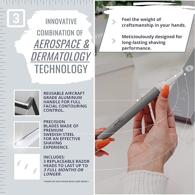 - Long-Lasting Skincare Tool: Features a durable aerospace-grade metal handle that is lightweight and tough, with 3 high-quality replaceable micro razor blades that slide on and off for easy replacement. Each blade is made to last multiple uses, saving you money on professional dermaplaning treatments.