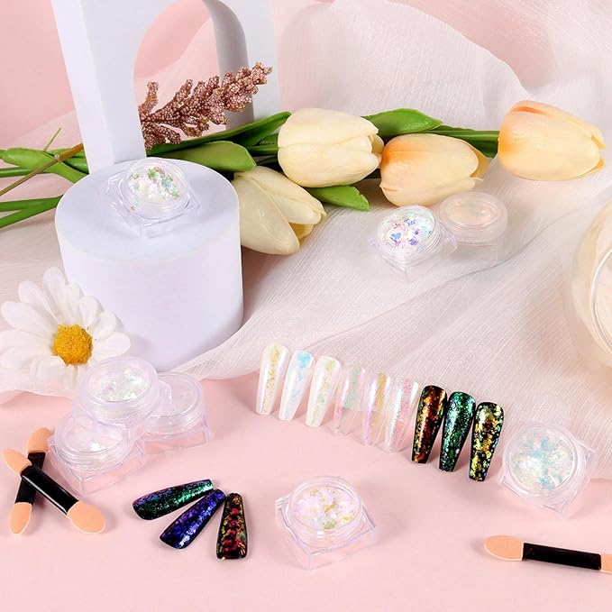 - Irregular Chameleon Flakes: 8 jars of chameleon nail glitter flakes in total, and comes with 8 nail sponge sticks.0.1g for each color, composed of small and irregular iridescent flakes, and made of pure synthetic resin powder.