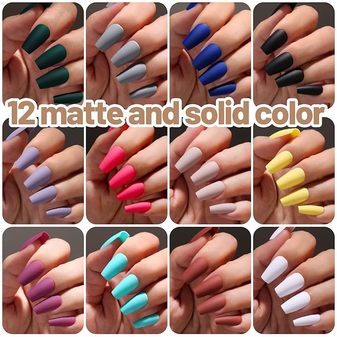 - Package Included: Total 288pcs press on nails short square and 10g false nail tips glue. 12 matte solid color: pink, brown, green, yellow, gray, purple, dark, white, royal blue, fuchsia, nude, forest green. The fake nails are packed in a transparent plastic box with 12 grids. Each grid packed 1 color and 24pcs press on nails in 10 different sizes, total 12 color and 288pcs.