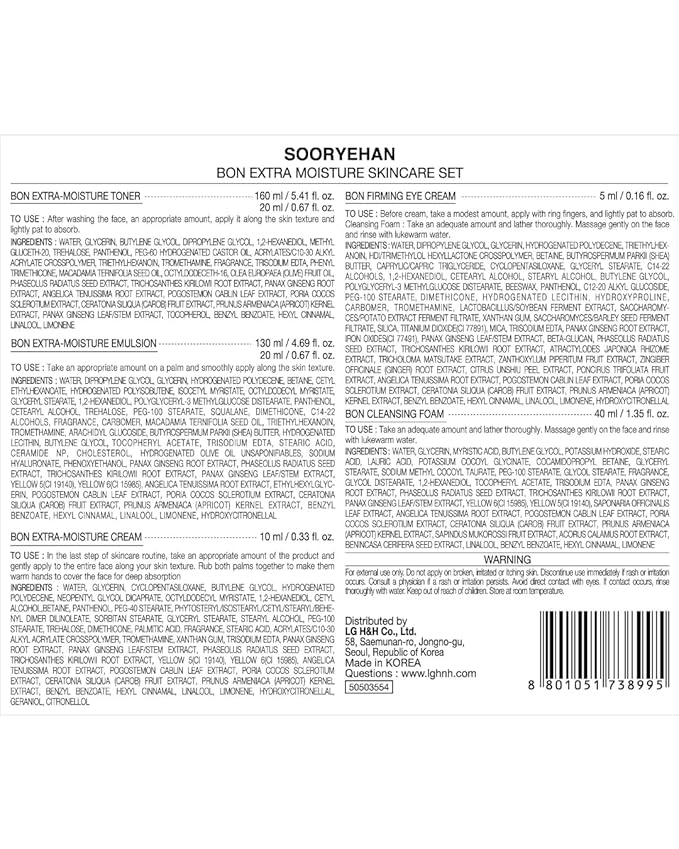 - BON EXTRA MOISTURE SKINCARE SET - Bon Extra Moisture Skin Toner (5.41 Fl Oz & 0.68 Fl Oz), Bon Extra Moisture Emulsion Lotion (4.40 Fl Oz & 0.68 Fl Oz), Bon Extra Moisture Cream (0.34 Fl Oz), Bon Firming Eye Cream (0.17 Fl Oz), and Bon Cleansing Foam (1.35 Fl Oz)