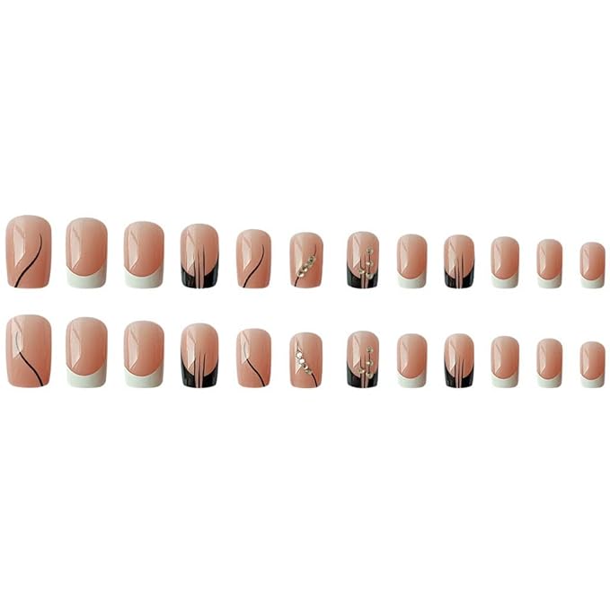 RikView French Tip Press on Nails Medium Acrylic Nails White Nails Black Stick on Nails with Rhinestones Coffin Fake Nails