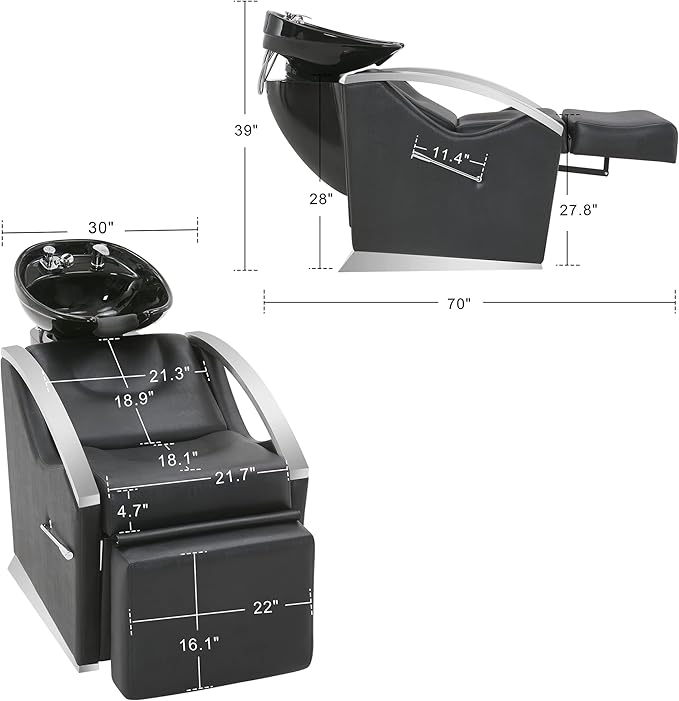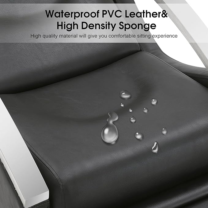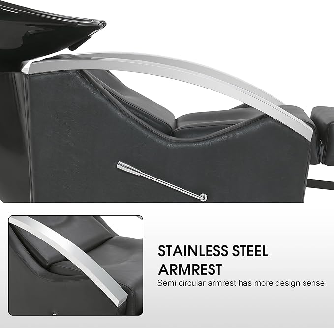 - Classic Design: Featuring a sleek black PVC leather finish with silvery armrests, the shampoo station chair combines aesthetics and functionality and is suitable for different barber shops, salons, and spa environments.