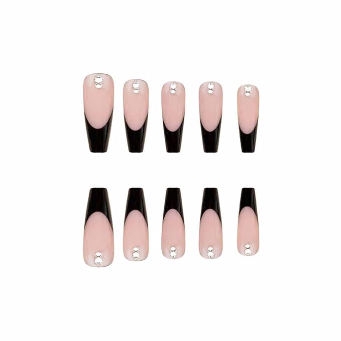 French Tip Press on Nails Long Acrylic Nails Black Fake Nails Coffin Nails with Rhinestones