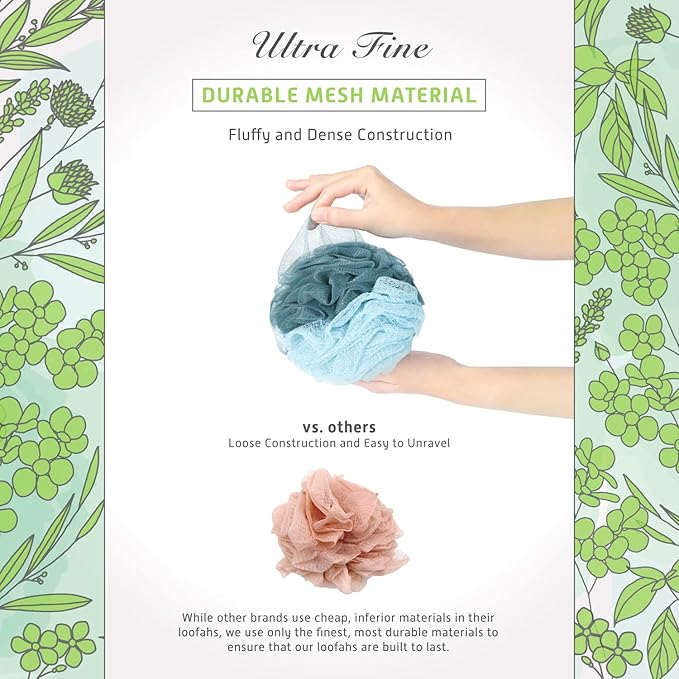- QUALITY CONSTRUCTION - The loofahs are fluffy and durable with ultra fine mesh material, making them the perfect choice for your daily exfoliating routine. They are gentle on your skin, providing a comfortable and enjoyable experience.