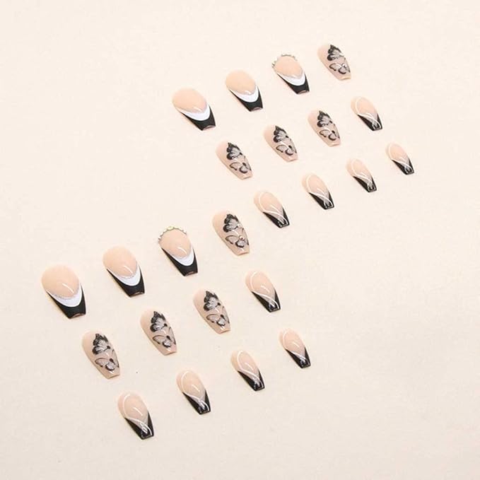 French Black Press on Nails Medium, Butterfly Fake Nails Nude Coffin Acrylic False Nails,Artificial Nails for Women and Girls-24pcs