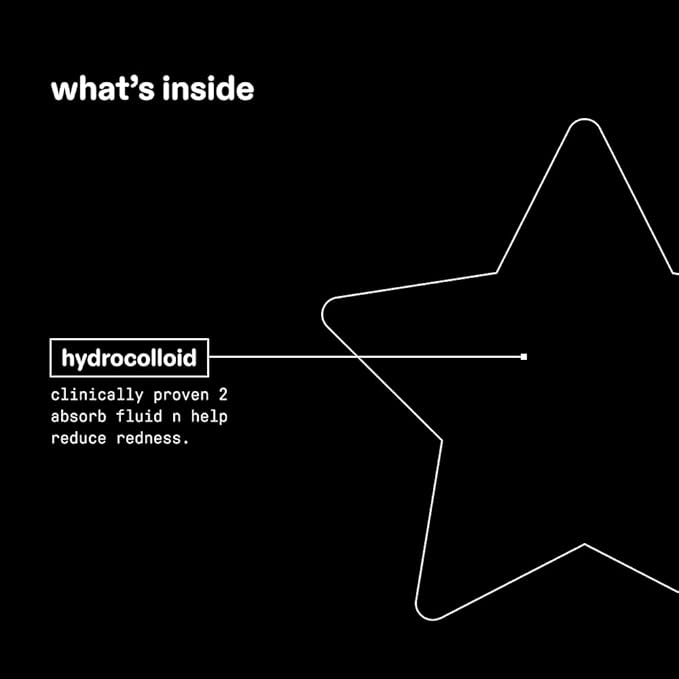 - CUTE & EFFECTIVE: Your favorite star-shaped pimple patches in a new black colorway. Made with 100% hydrocolloid to help absorb fluid, reduce redness, and shrink spots while looking cute.