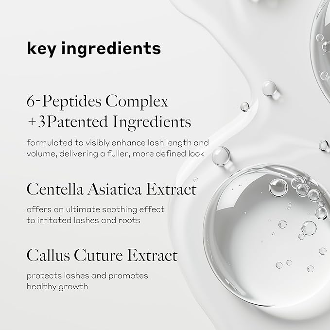 - 6-PEPTIDES COMPLEX, as a key ingredient, boosts lash length and volume, creating a fuller and more defined look.
