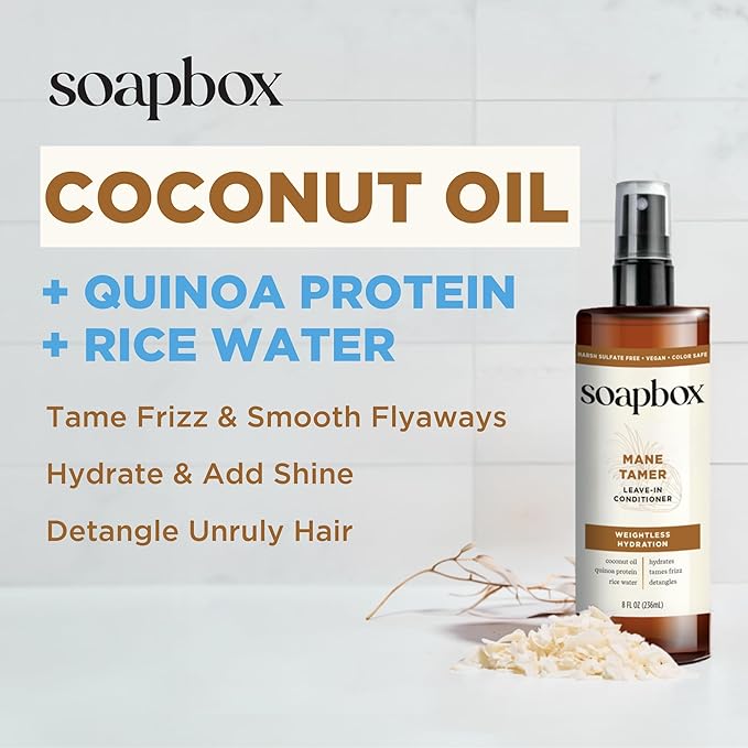 Soapbox Mane Tamer, Leave-In Conditioner Spray to Tame Frizz, Smooth Fly Aways, Hydrate, Add Shine & Detangle Dry, Damaged Hair, Paraben Free, Vegan (8oz)