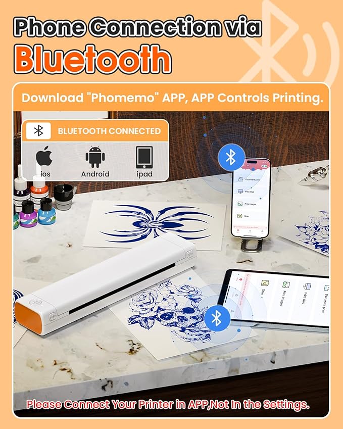- Powerful Phomemo App - Say goodbye to complicated printing processes - our Phomemo App allows for one-click printing of images and documents. Unlike traditional tattoo printer machine that require printing on white paper before copying, you can print your designs instantly with our app. Plus, for optimal printing results, we recommend using Phomemo Tattoo Transfer Paper