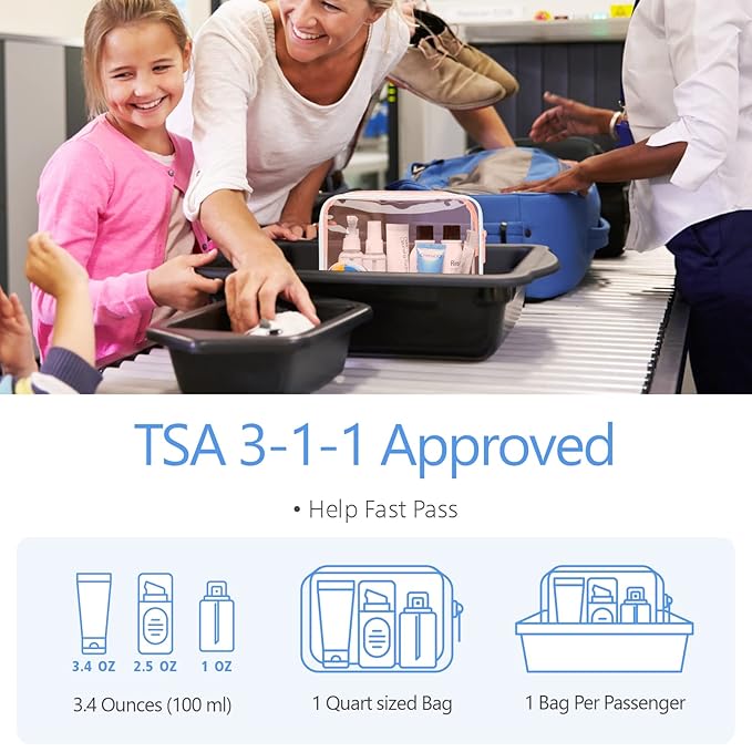 - 【TSA Approved】Fly stress-free with this 7.5 x 5.5 x 2.2 inch (19 x 14 x 5.5 cm) tsa approved toiletry bag that meets all airline 3-1-1 liquid rules; Speed through security checks without unpacking thanks to the compliant transparent design