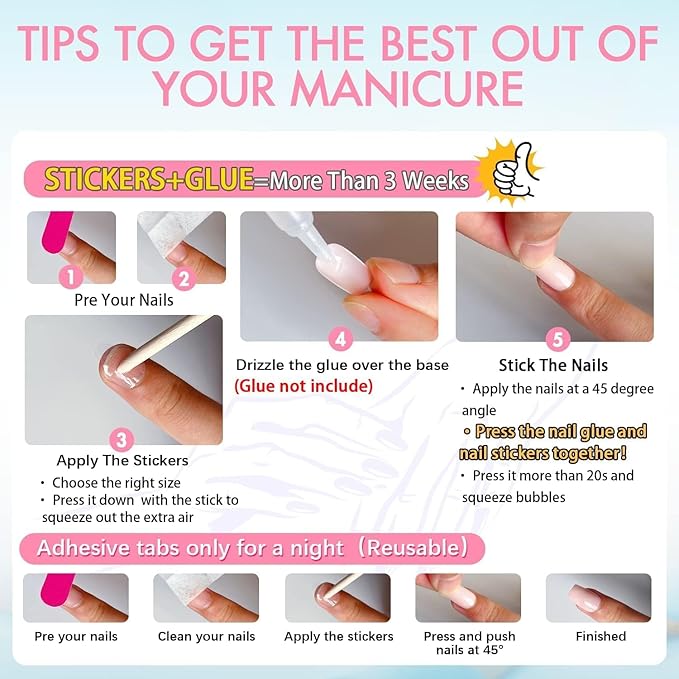 - A Game Changer:These short false nails square come to wear,with no glue or nail polish required and no drying time,super easy to apply.We also give u everything you need just in case.TIP:NO GLUE INCLUDED