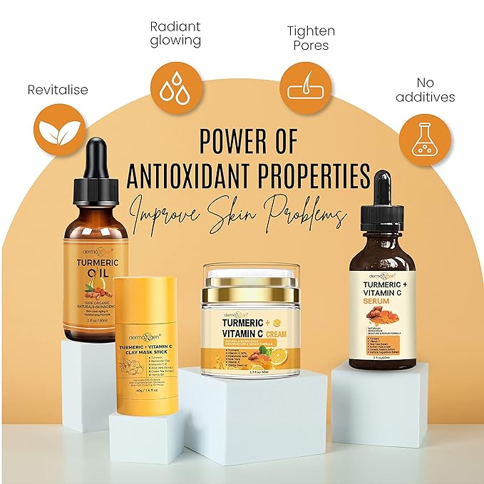 - RADIANT TURMERIC SKIN: For centuries people all over the world have used turmeric for its healing and cosmetic properties. This bright yellow spice is available as a ground spice, in supplement form, or also in various beauty products. Turmeric has potent natural, organic antioxidant properties. These characteristics of turmeric provide luster and glow to the skin. Turmeric also helps revive and boost the skin by bringing out its natural glow.