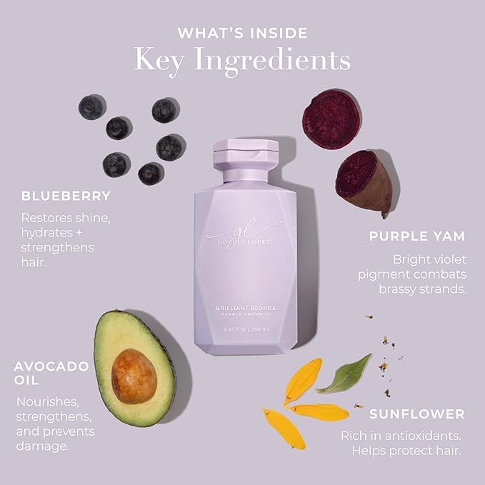 Goldie Locks Brilliant Blonde Purple Shampoo for Blonde, Lightened, Grey Hair & Extensions, Brightens, Tones, Eliminates Brass, Sulfate-Free, Nourishing, Moisturizing, Color Safe, 8.45 Fl Oz Bottle