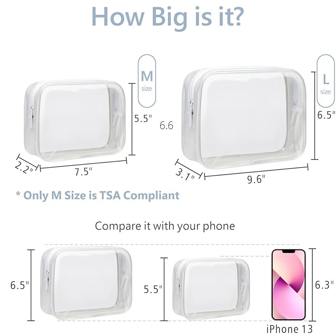 - TSA Approved, Meet Liquids Rule: The medium size clear makeup bag is 7.5 x 2.2 x 5.5 inch, it follows the TSA's 3-1-1 Liquid Rule published by TSA. You can quickly pass the airport security screening. Note: the large size clear bag is 9.6 x 3.1 x 6.5 inch, it is larger than one quart and is not TSA approved