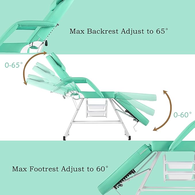 - 【Adjustable Ergonomic】 The massage table headrest and footrest is easily adjust to comfortable angle according to the needs of the clients, The maximum adjustable angle of the backrest is 65°, and the footstool can be tilted to 60°. The wide backrest and adjustable angle fits the body curve, which is ergonomic.