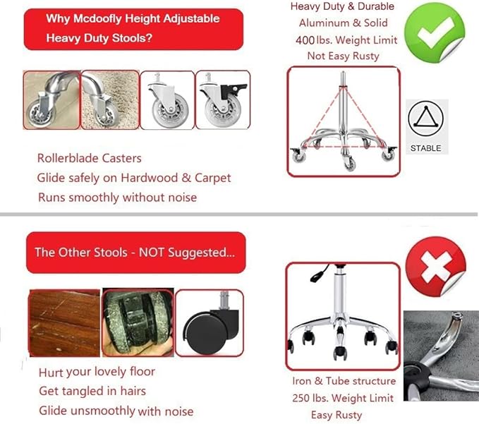- Very Sturdy and Well Made Stool: Compared to ordinary stools on the market, our rolling stool adopts premium PU leather, brand new high-density sponge, even the bottom of seat cushion is fully covered with leather. SGS and TUV certified gas lift cylinder, nice aluminum base with popular roller-blade style casters. Weight capacity is 400 lb. That’s why ours is a little expensive than others, but quality is much better