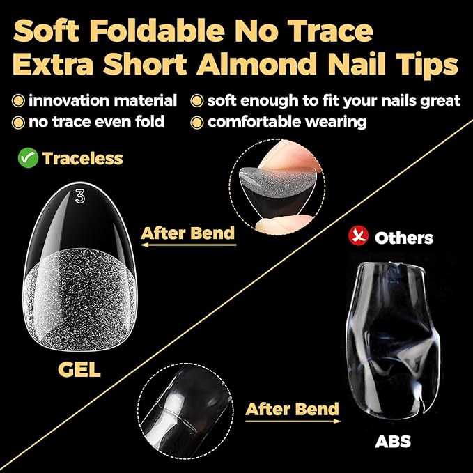 - 💅【Extra Short Almond Nail Tips with No Trace】The clear almond fake nails are gelly soft tips and will make no trace even bend, bright clear you can more easily press, trim, paint flat false nails to make your dream nails shape. Real DIY manicure gel tips.