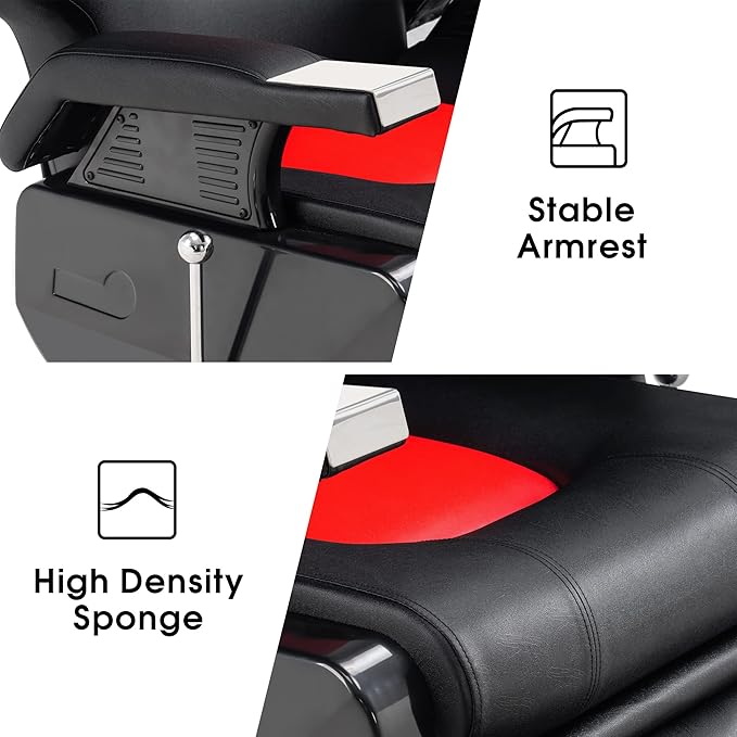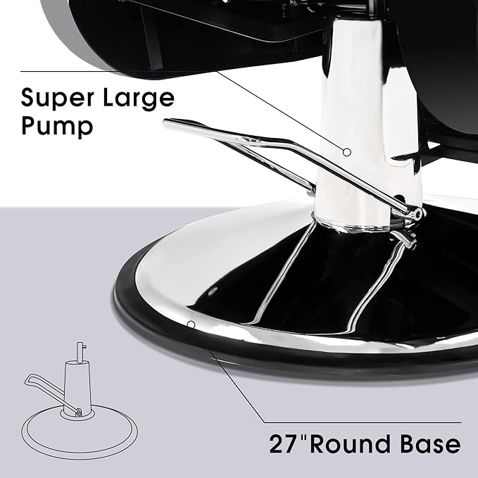 - Improved Stability & Flexibility: The classic barber chair can swivel 360° and can be flexibly reclined to 139°(backrest can be easily adjusted to multiple locking positions by a gas-piston lock &release mechanism).The headrest can be removed if the hair stylist need to wash hair for their customer.The footrest is fixed and the leg rest can be adjusted when reclining the chair which will bring more relax to your legs.The height adjustment of hydraulic pump is over a 5.1" range.
